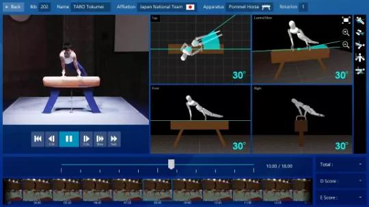 圖像可視化顯示通過(guò)3D感測(cè)測(cè)量的體操者表演者的骨骼運(yùn)動(dòng)和位置,并且顯示裁判員根據(jù)體操得分規(guī)則進(jìn)行評(píng)分所需的信息。記錄體操和其他運(yùn)動(dòng)的一系列縮略圖按時(shí)間順序被顯示在由實(shí)線表示的下部行中的多個(gè)小框中,從縮略圖中選擇的圖像也由實(shí)線表示在左上方的大框中。從平面,正面,側(cè)面和裁判要檢查的角度捕獲的圖像被顯示在右上角的四個(gè)中間框架中,并且在四個(gè)中間框架中的每個(gè)框架中,還顯示有根據(jù)計(jì)分規(guī)則進(jìn)行計(jì)分的信息。