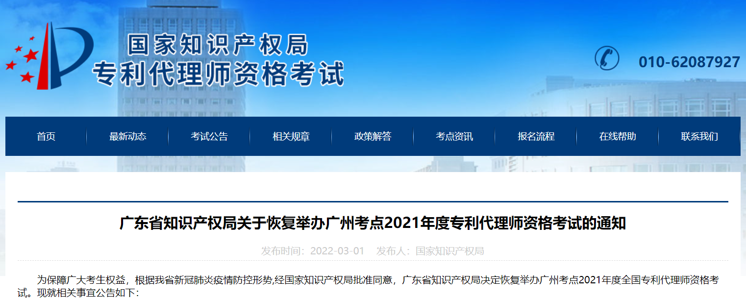 近期,多地發(fā)布關于恢復舉辦2021年度全國專利代理師資格考試的通知。廣州、鄭州、杭州、重慶、西安考點將于2022年3月26日至27日恢復舉辦2021年度全國專利代理師資格考試。