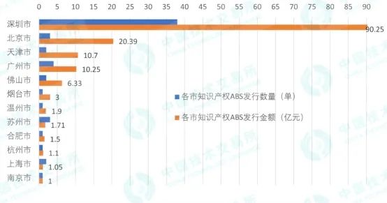 截至2021年12月31日,按原始權(quán)益人注冊地統(tǒng)計,我國已有12個城市設(shè)立發(fā)行知識產(chǎn)權(quán)ABS。其中,深圳市累計發(fā)行38單,合計金額90.25億元,所占比例均為全國最高,分別為64%和60%。