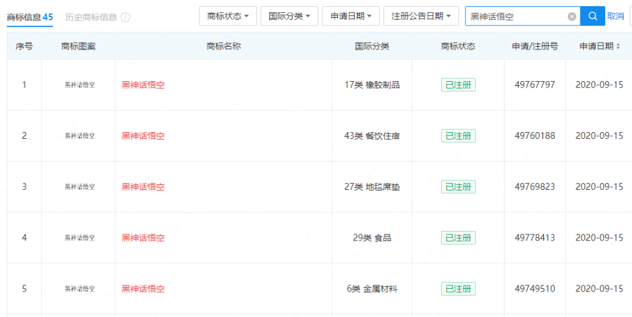 2020年起,游戲開(kāi)發(fā)團(tuán)隊(duì)的關(guān)聯(lián)公司深圳市游科互動(dòng)科技有限公司就對(duì)“黑神話悟空”、“黑神話”等相關(guān)商標(biāo)進(jìn)行了全類別注冊(cè),甚至注冊(cè)了系列以“黑神話”為前綴的商標(biāo),力求全方位無(wú)死角的保護(hù)這個(gè)核心IP。但值得一提的是,該游戲中玩家扮演的角色“天命人”似乎已被搶注。根據(jù)檢索結(jié)果,2023年12月,自然人王某申請(qǐng)注冊(cè)2枚“天命人”商標(biāo),國(guó)際分類為廣告銷售、辦公用品。目前,上述商標(biāo)已成功注冊(cè)。