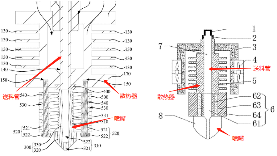 例如,本申請(qǐng)專利CN107738440A,一種FDM型3D打印機(jī)及3D打印頭,如下圖中的左圖所示。對(duì)比文件1專利CN205185337U,一種3D打印機(jī)用金屬噴頭,如下圖中的右圖所示。