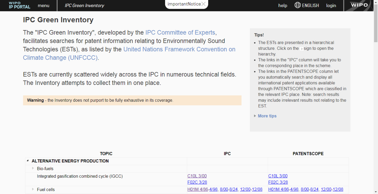 WIPO的“IPC Green Inventory”(國(guó)際專利分類綠色清單工具)由IPC專家委員會(huì)開(kāi)發(fā),依據(jù)《聯(lián)合國(guó)氣候變化框架公約》(UNFCCC)所列技術(shù)詞語(yǔ)制定,分為可替代能源、交通運(yùn)輸、能源節(jié)約、廢棄物處理、農(nóng)林業(yè)、行政監(jiān)管與設(shè)計(jì)、核能發(fā)電共7個(gè)綠色專利主題,涉及約200個(gè)與環(huán)境友好技術(shù)直接相關(guān)的類別,對(duì)每一類別都列出了由專家選定的與其最相關(guān)的國(guó)際專利分類位置。