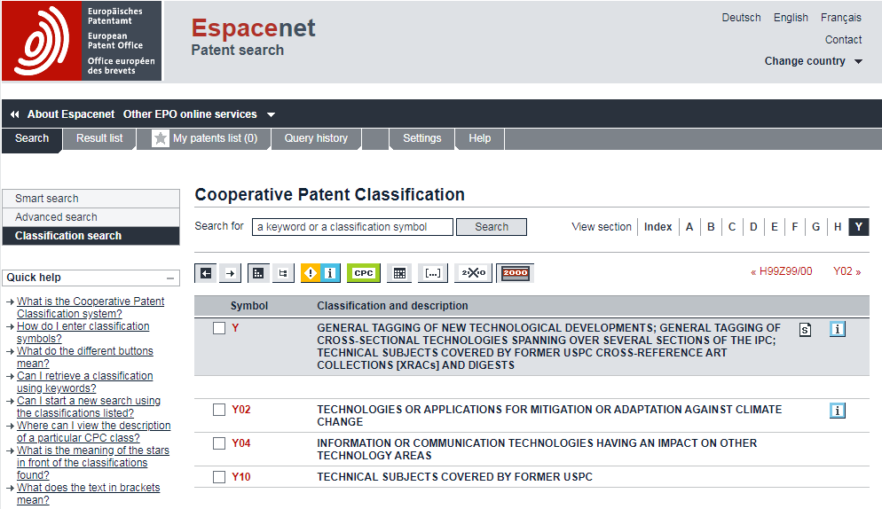 進(jìn)入EPO的專利數(shù)據(jù)庫(kù)Espacenet使用分類號(hào)檢索,點(diǎn)擊“Y”部就可找到“Y02”、“Y04S”。
