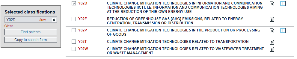 例:若我們想了解“信息與通信技術(shù)中的氣候變化緩解技術(shù)”的專利信息,可勾選相應(yīng)的小類“Y02D”進(jìn)行檢索。