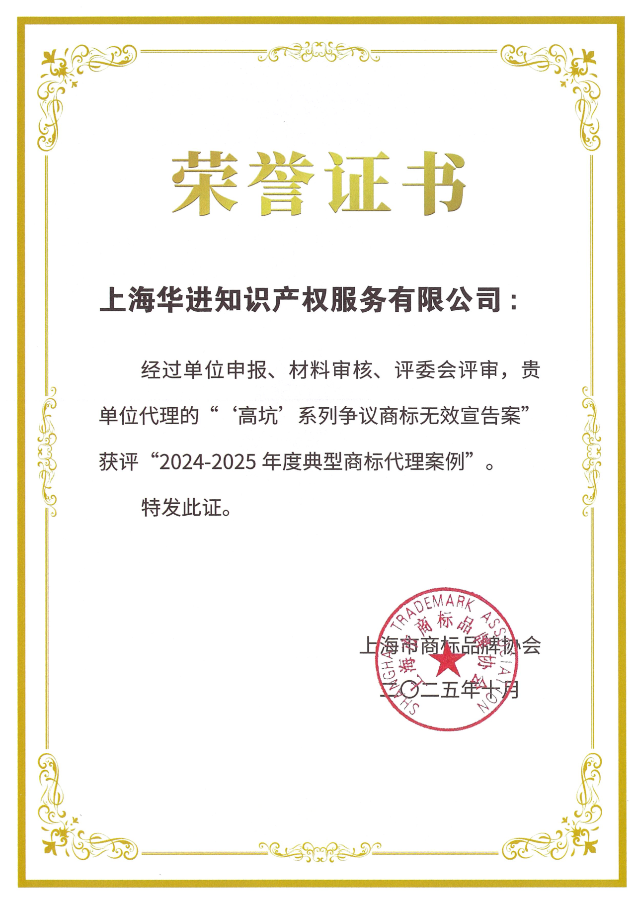 2025年10月16日,“榮光三十年·同心再啟航”上海市商標品牌協(xié)會成立30周年慶典在上海成功舉辦。會議期間,協(xié)會對在商標品牌領域作出突出貢獻的單位與個人進行了表彰,并公布了2024-2025年度典型商標代理案例評選結果。華進報送的“‘高坑’系列爭議商標無效宣告案”獲評“2024-2025年度典型商標代理案例”。