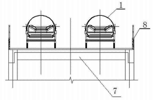 (1)所述防護罩包括罩體、第一擋板及第二擋板,所述罩體固定于所述輸送機,所述第一擋板及所述第二擋板樞接于所述罩體兩側(cè)壁、并且分別位于所述輸送機兩側(cè),所述第一擋板的自由端與所述第二擋板的自由端之間的距離不小于所述隔離墻靠近污水區(qū)的兩側(cè)壁之間的距離;所述第一擋板的自由端、所述第二擋板的自由端均抵持于所述隔離墻頂部;