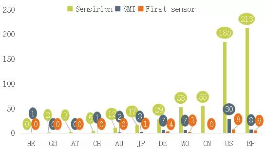 SMI于2002年被瑞思邁并購。First sensor為德國企業(yè),Sensirion為瑞士企業(yè),盛思銳貿易(深圳)有限公司是SENSIRION的全資子公司,在整個中國地區(qū)負責SENSIRION產品的銷售和服務。另,Honeywell為行業(yè)龍頭企業(yè),專利數(shù)量大,本次不作分析。