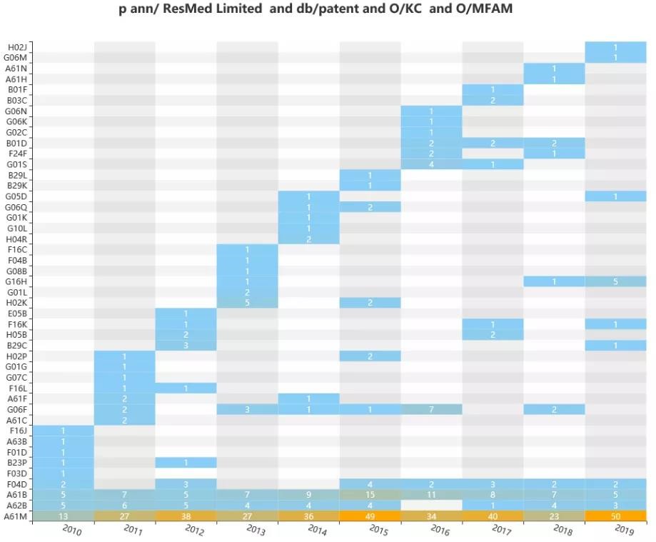 從上圖及表中可知,費雪派克與瑞思邁間的專利引用交集大,產品技術重疊度高,競爭最為激。怡和嘉業(yè)作為國內企業(yè),可能是因為主要申請在國內,在審查中很少用到其它同行在先專利申請,很少有相互引用的數(shù)據(jù)體現(xiàn)。
