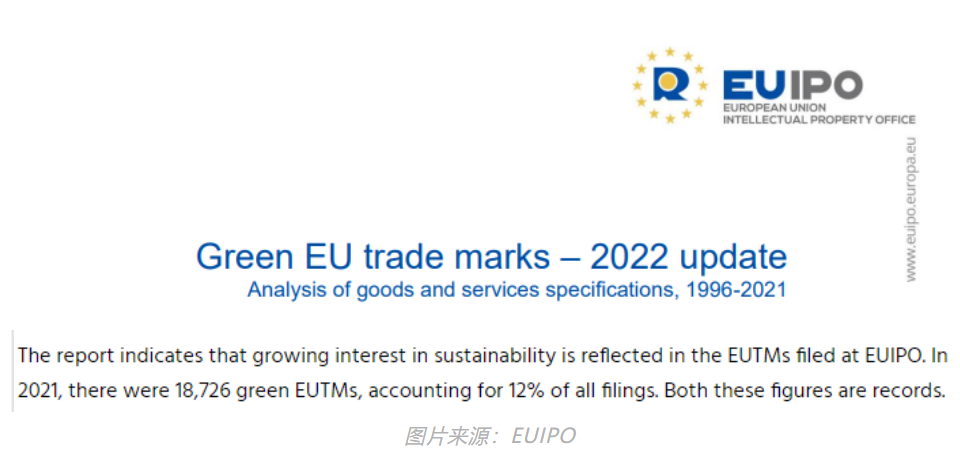 2021年,歐盟知識產(chǎn)權(quán)局(EUIPO)通過歐洲知識產(chǎn)權(quán)侵權(quán)觀察站進行了一項關(guān)于綠色歐盟商標的研究,旨在研究公眾和政策制定者對氣候變化和環(huán)境惡化的日益關(guān)注是否反映在歐盟商標申請中。2023年2月發(fā)布的《綠色歐盟商標——2022年更新(Green EU trade marks-2022 update)》顯示2021年在EUIPO申請的綠色歐盟商標數(shù)量創(chuàng)下了歷史新高。